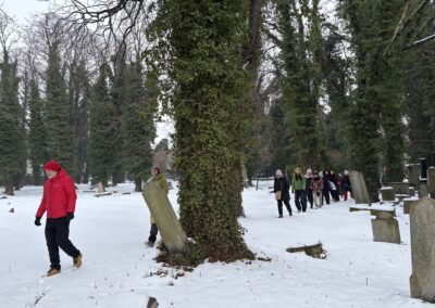 Podczas wizyty studyjnej w Bielsku-Białej zespół Ośrodka Kultury Ochoty z Warszawy odwiedził m.in. Centrum Bajki i Animacji OKO, Instytut Odporności Społecznej, Miejski Domu Kultury oraz Galerię Bielską BWA – Willę Sixta. Wyjątkowym doświadczeniem dla grupy OKO był spacer i opowieść o mieście wielu kultur i religii, który poprowadził Jacek Bożek – założyciel i lider Klubu Gaja. Po spotkaniu w Willi Sixta Galerii Bielskiej BWA, 14 stycznia, zespół OKO udał się na Cmentarz Żydowski, by odkryć Tajemniczy Ogród – unikatową przestrzeń religii, kultury i przyrody współtworzoną przez Klub Gaja, Miasto Bielsko-Biała i Gminę Wyznaniową Żydowską w Bielsku-Białej. Uczestnicy i uczestniczki spotkania mogli zapoznać się z historią miejsca, procesem społecznym tworzenia Tajemniczego Ogrodu przy udziale mieszkańców oraz wieloletnimi działaniami społecznymi, ekologicznymi i kulturalnymi Klubu Gaja, a także powspominać wspólne inicjatywy! Początki współpracy Klubu Gaja i OKO sięgają lat 90-tych, kiedy OKO zaczęło organizację Dnia Ziemi w Warszawie. Wizyta w Tajemniczym Ogrodzie zakończyła się wspólnym działaniem warsztatowym.